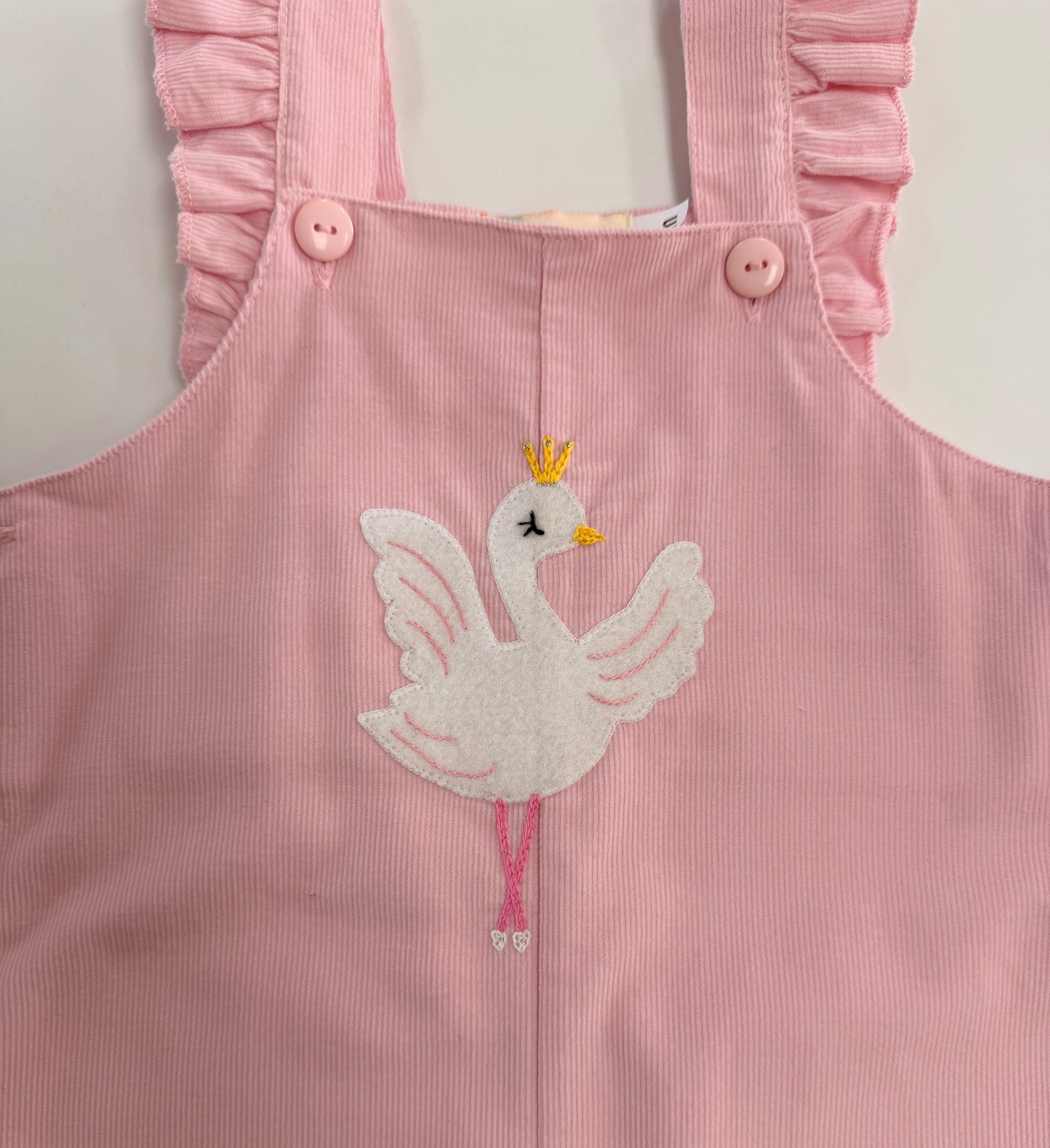 Girls Ruffle Light Pink Corduroy Romper-Ballerina Swan with Crown Appliqué